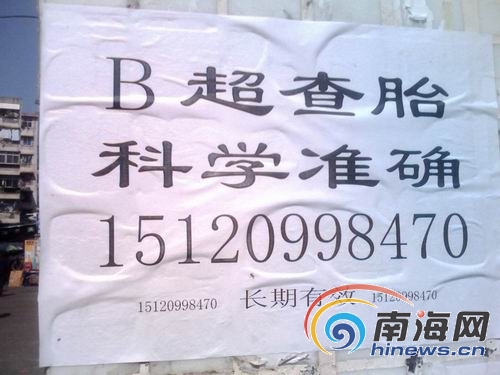“只要你愿意花800元,肚子里懷的是男是女,一查便知!”連日來在?诘拇蠼中∠飪(nèi),出現(xiàn)了很多類似的廣告。那么,這一明顯違反國家規(guī)定的行為究竟是怎么回事呢?1月13日至1月14日,記者連續(xù)兩天進行暗訪,一探究竟。
