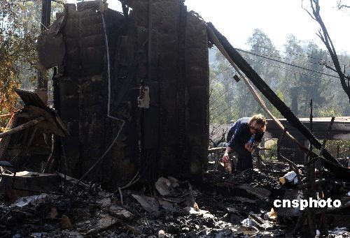 圖為消防員在蒙特塞托市一處被焚毀的房屋廢墟上防止死灰復燃。
