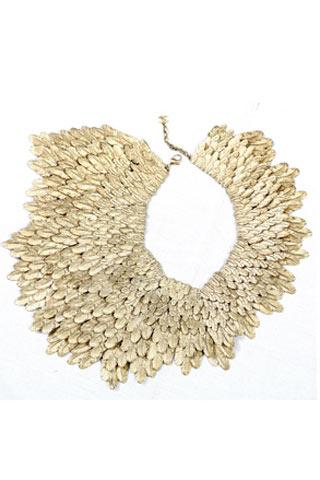 香奈兒專屬羽飾Desrues工坊似乎能把所有的不可能變?yōu)榭赡,就像中?guó)古代的能工巧匠能把黃金做成葉脈清晰的樹(shù)葉一樣,他們用黃金打造出了羽毛質(zhì)感清晰的頸飾并依照大小層層排列,在塑造肌理質(zhì)感的同時(shí)讓其栩栩如生起來(lái)。