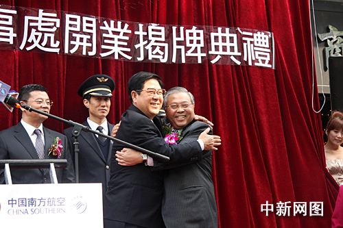 1月15日,大陸南方航空公司在臺(tái)北正式成立辦事處,成為首家在臺(tái)灣掛牌運(yùn)營(yíng)的大陸企業(yè)。圖為開業(yè)揭幕儀式典禮上,南航董事長(zhǎng)司獻(xiàn)民(左一)與臺(tái)灣華航董事長(zhǎng)魏幸雄熱情擁抱。中新社記者 陳立宇 攝