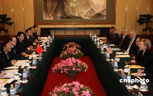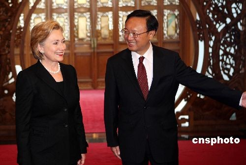 2月21日上午,中國(guó)外交部部長(zhǎng)楊潔篪與美國(guó)新任國(guó)務(wù)卿希拉里·克林頓在北京釣魚(yú)臺(tái)國(guó)賓館舉行會(huì)談。中新社發(fā) 任晨鳴 攝