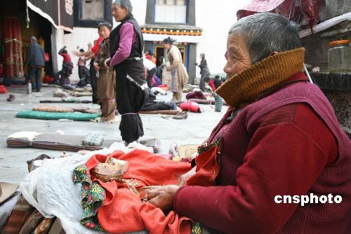3月14日,藏族信徒一如尋常前來大昭寺轉經朝拜。唯一不同的是,大昭寺廣場和八廓街顯得格外寧靜,很難看到往日涌動的游客,八廓街不少商店和攤鋪還在營業(yè)但生意冷清。中新社發(fā) 王林 攝