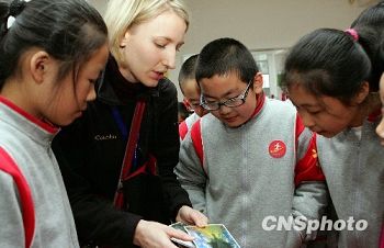 12月7日,2009年“漢語橋——美國中小學(xué)校長訪華之旅”代表團首次來閩交流訪問。70名代表中,33名代表來福州參觀訪問,37名赴廈門參觀訪問。圖為美國科羅拉多學(xué)院代表正與福州實驗小學(xué)學(xué)生交流,介紹美國風景。據(jù)了解,近年來,美國開設(shè)漢語課程的中小學(xué)大幅增加,已由2005年的263所增至2009年779所。漢語已經(jīng)成為美國外語教學(xué)中發(fā)展最快的語種。(中新社/張麗君 攝)