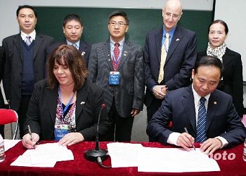 12月7日,美國(guó)圣地亞哥河景小學(xué)和福州實(shí)驗(yàn)小學(xué)在福州簽訂了建立姐妹學(xué)校意向書(shū)。當(dāng)日,中美中小學(xué)校長(zhǎng)座談會(huì)在榕舉辦,美國(guó)33名中小學(xué)代表與福州近20所中小學(xué)校長(zhǎng)及教師代表進(jìn)行了廣泛深入的交流,共同探討漢語(yǔ)教學(xué)與中國(guó)文化交流以及在美國(guó)中小學(xué)開(kāi)設(shè)孔子課堂及派遣赴美漢語(yǔ)教學(xué)志愿者等項(xiàng)目合作意向。(中新社/張麗君 攝)