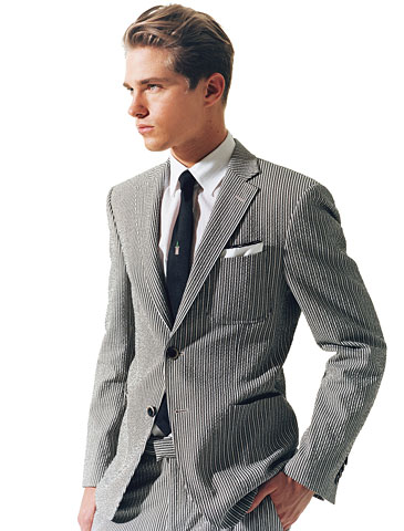 七:條紋外套?肯定!再發(fā)愁你的條紋西裝沒法穿么?的確,如今大概只有四歲的孩子和沒有時(shí)尚品味的人才會(huì)選擇那種淺色的泡泡紗外套來作為自己的“出場”服裝。但是,告訴你個(gè)方法,只要簡單的加上黑色和白色的話,這款搭配就變得相當(dāng)?shù)挠行、成熟了。搭配白色的襯衫,黑色的領(lǐng)帶,和一塊口袋方巾,那么無論是日常的辦公或者是小型的PARTY聚會(huì),就都很合適了!