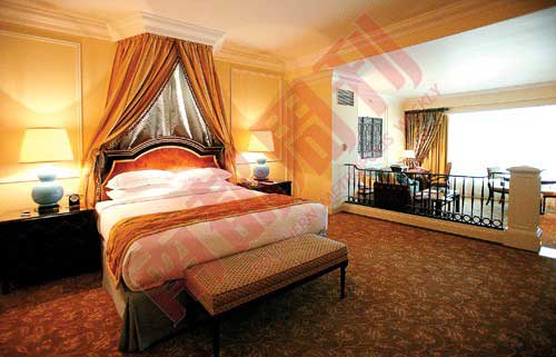 我上次住的是酒店南翼套房,據(jù)說(shuō)威尼斯人的三千間豪華客房每間的面積都不小于60平方米,是那種躍式風(fēng)格,也就是客廳和寢室的區(qū)域劃分非常清楚。