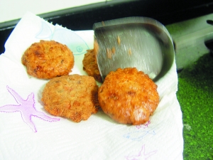 6 撈起鯪魚餅,用廚房紙吸干余油,即可裝盤上桌。