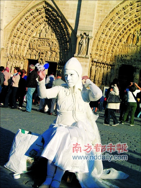 這個美女把自己渾身抹得雪白,扮成雕塑。