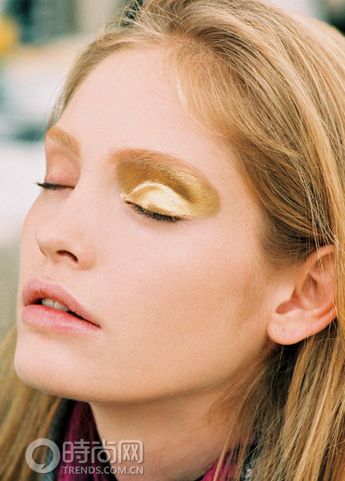 在金色眼影上畫一條粗細(xì)適當(dāng)?shù)难劬,畫眼線時(shí)不妨將臉部的角度調(diào)整得低一點(diǎn),可以讓眼尾有自然的幅度。在黑眼球的上方,輕輕地重復(fù)加強(qiáng)描繪,由眼角往眼尾方向慢慢加粗,然后用棉花棒將描繪過(guò)的眼線暈開,可以讓眼線線條變得柔和、立體。