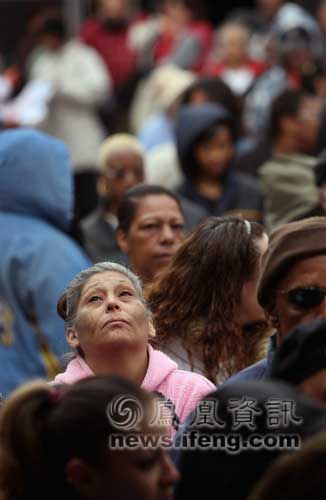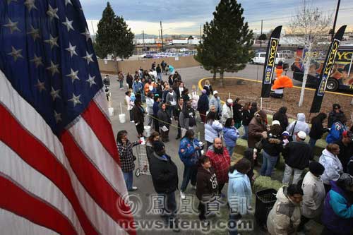 2008年11月25日,美國科羅拉多州丹佛市,人們?cè)诤L(fēng)中排隊(duì)等待領(lǐng)取感恩節(jié)的免費(fèi)火雞和其他食物。丹佛市的慈善機(jī)構(gòu)計(jì)劃在感恩節(jié)之前向大約1200戶有需要的困難家庭發(fā)放感恩節(jié)食物。
