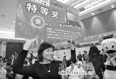 參加旅游還中了大獎,周小姐興奮地舉起了獎品牌留影。吳偉洪攝
