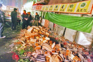昨日下午,小吃店周?chē)牡孛嫔媳椴加蜐n和水跡,幾名男店員將倒塌的外墻瓦礫鑿開(kāi)、運(yùn)走。對(duì)于事發(fā)時(shí)的情況,店員均不愿多談。據(jù)目測(cè),坍塌的外墻寬約3米,高約2.5米。