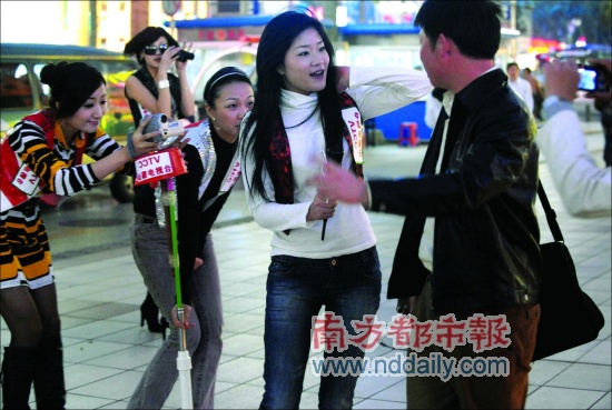 由于她們身材高挑、長(zhǎng)相標(biāo)致、穿著性感,很快便吸引了大量圍觀者。起初現(xiàn)場(chǎng)沒(méi)有人愿意接受這些行為怪異的女“記者”采訪,采訪受阻后,美女們將目標(biāo)重新定位,瞄準(zhǔn)了過(guò)往行人中的帥哥。效果還不錯(cuò),其中幾名帥哥抵擋不住“辣妹”的誘惑,非常豪爽地接受了采訪。