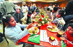 12月24日,圣誕節(jié)前夕,在美國加利福尼亞州洛杉磯市一慈善機(jī)構(gòu)內(nèi),數(shù)千名兒童享用著該機(jī)構(gòu)提供的圣誕大餐