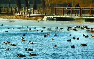昨日,野鴨在奧林匹克森林公園水中游弋。共300多只野鴨到此過冬。本報記者 浦峰 攝