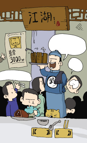 “幸會!幸會!各位大俠請進(jìn)!”飯店的特色從一進(jìn)門便“撲面而來”,店里的服務(wù)員統(tǒng)稱為“店小二兒”,顧客成了“掌門人”,餐桌號也用各大門派來命名,“華山派”、“逍遙派”、“古墓派”等門派名稱在店里都能見到。