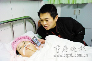 “小豬兒,來,聽聽歌曲!弊蛉丈衔11時,巴南區(qū)人民醫(yī)院神經(jīng)外科病房,42歲的趙江用手機播放著“你問我愛你有多深”。病床上,女友朱永萍眼睛似閉非閉,毫無反應。