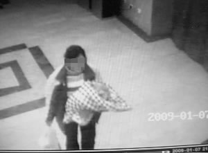 監(jiān)控錄像顯示:一名30歲左右的女子身穿白黑紅三色棉襖或羽絨服,內(nèi)穿兩色條紋毛衣,身高在1米60左右。晚上9點(diǎn)36分40秒,這名女子從西樓的東門(mén)進(jìn)入大樓,當(dāng)時(shí)手中抱著女?huà)耄靡粭l花格包被包著,同時(shí)右手還提著塑料袋。