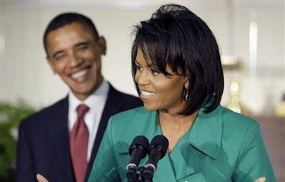 這位準第一夫人每次的著裝都很嚇人,不過這身綠色的職業(yè)裝真的很適合他。簡單的剪裁與冷色系的顏色為她增加了一絲高貴大方的感覺。用心吹過的頭發(fā)充滿時尚感,前面的發(fā)簾與蓬松的感覺都讓她充滿了女人的味道,難怪站在他身后的奧巴馬都深情含笑的望著她。
