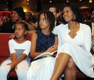 很少看到奧巴馬全家都出動的場面。這次妻子與兩個女兒一起為他助威。白色幽雅的長裙讓奧巴馬的妻子看起來很平時很不一樣。純白的顏色把她巧克力色的肌膚襯托的美麗動人。設計感十足的圓領加V領不僅時尚幽雅,還有些性感的味道。這樣的長裙穿在她身上顯示出十足的準第一夫人架勢。