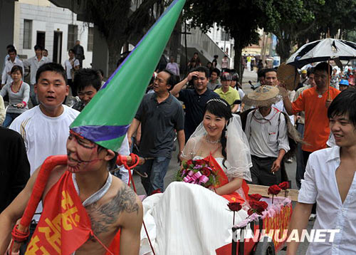 當(dāng)日,在廣西南寧市白沙大道,從湖南邵陽(yáng)市來(lái)南寧工作的新郎毛文旻(前左一),身著奇裝異服,用“!崩遘嚨姆绞接⑿履,引起眾多市民的圍觀。據(jù)毛文旻從湖南邵陽(yáng)老家趕來(lái)參加婚禮的親友介紹,這種迎親方式是他們的傳統(tǒng)婚俗。新華社記者 周華 攝