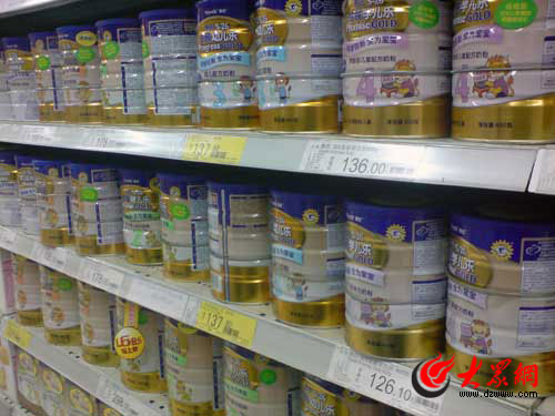 24日上午,記者在大潤發(fā)歷下店和濟(jì)南銀座商城的奶粉柜臺看到,惠氏奶粉仍然擺在貨架上,價(jià)格也未發(fā) 生變化;而在家樂福超市,記者看到惠氏奶粉已經(jīng)被擺上了促銷柜臺的顯著位置,記者注意到,惠氏2段S26金 裝健兒樂900克聽裝奶粉當(dāng)天售價(jià)仍然是178元,而惠氏3段S26金裝健兒樂900克聽裝奶粉售價(jià)已從155.8元直降 到137.8元,降幅達(dá)到18元。銷售人員告訴記者,惠氏被曝光的事她已經(jīng)知道,但并未接到下架通知,盡管她表示惠氏降價(jià)與“結(jié)石門”無關(guān),但記者從價(jià)格標(biāo)簽上看到,降價(jià)銷售的標(biāo)簽是24日當(dāng)天新?lián)Q的;在沃爾瑪超市,記者看到惠氏同樣在降價(jià)促銷,降幅與家樂福相同。