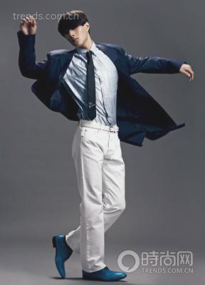 黑色外套 Prada、藍(lán)色襯衫 Versace、白色褲子 dunhill、皮帶 Z Zegna 、皮鞋 Salvatore Ferragamo
