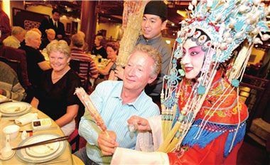 昨晚7點,在前門全聚德烤鴨店,京劇、川劇變臉和老北京的糖葫蘆,讓來自美國的130余名游客感受了一把地道的中國風(fēng)。而這也是今年以來,該店接待人數(shù)最多的一個外國旅游團隊。(記者范繼文 胡笑紅攝影報道)