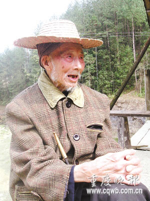 唱歌的老者坐在院壩前,滿頭白發(fā),滿臉皺紋,手拿一根近1米長的煙桿,煙已熄,他沒發(fā)現(xiàn)。