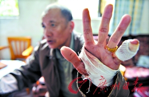 事件:洪叔家來了三個不速之客,他們手持大刀,跳進圍墻,先是捂住洪叔的嘴,然后還舉刀砍向老伴美姨,洪叔掙扎著跑到美姨前面,雙手擋刀拼命去救老伴,歹徒連砍幾刀,見兩老人誓死反抗,且驚動了周圍街坊,歹徒逃走。