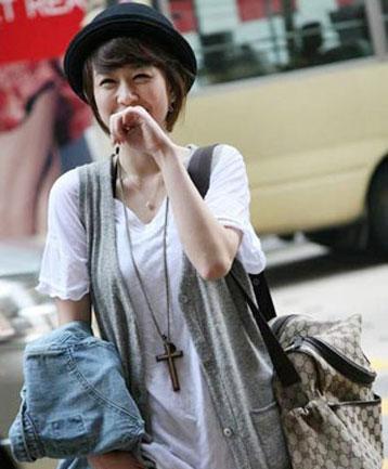 白色的基本款T恤搭配灰色針織馬甲幫你修飾難看水桶腰,黑色的小禮帽讓你將裝扮玩味到底。