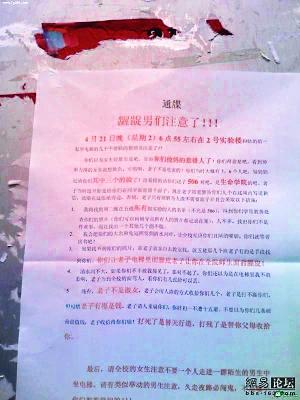 事情源于該女生在4月21日晚的一次不愉快的電梯經(jīng)歷。據(jù)稱,當晚6點55分左右,該位女生在2號實驗樓與幾個“齷齪男”一起乘電梯。期間,女生慘遭“齷齪男”們毛手毛腳。雖然當時十分憤怒,但鑒于一個人“勢單力薄”,被“猥褻”的女生忍著沒有作聲。她暗暗記下了幾個“齷齪男”上課的實驗室,并寫下這張大字報,貼在大學校園內(nèi)。