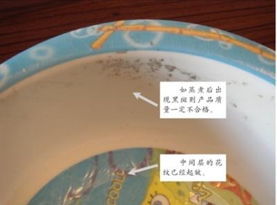 或者,您也可以參照《QB 1999—94密胺塑料餐具》標準中耐濕熱性的試驗方法,把餐具放在沸水中浸煮30分鐘后取出,在室溫中放置一小時,重復3次后,如果餐具出現(xiàn)發(fā)白、發(fā)澀、起泡、開裂以及有刺鼻氣味等現(xiàn)象,說明餐具產品質量存在問題。