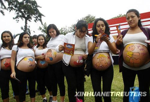 5月20日,在秘魯首都利馬,幾名孕婦在腹部畫上嬰兒圖案,參加“健康孕婦周”慶;顒。新華社/路透