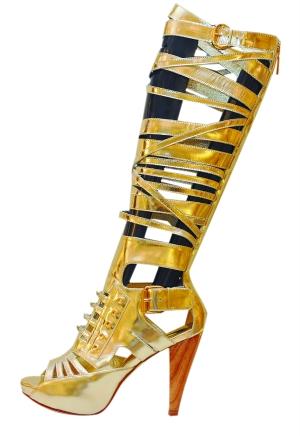 搭配指南:金色夸張的捆綁式高靴,因為本身就很復雜,所以身上的服飾最好以簡潔為主。復古透明金鞋很百搭,休閑場合也能成為焦點。