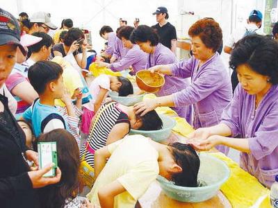 隨后,朋友陪同記者參加慶祝活動(dòng),記者看到姑娘們用菖蒲根做成簪子別在頭上,男人們則將菖蒲根纏在腰上。朋友說,這象征可以防止頭痛和災(zāi)厄的發(fā)生。慶;顒(dòng)中有很多儀式,孩子用菖蒲水洗頭發(fā),祈求健康;人們點(diǎn)燃許愿燈,祝愿家人平安。來(lái)自農(nóng)村的民俗表演是整個(gè)活動(dòng)中最熱鬧的。小伙子舞動(dòng)繪有龍圖案和寫有“農(nóng)者天下之大樂”等字樣的大旗,身穿韓服的人們邊敲鼓邊圍成圈跳舞,一些人則裝扮成小丑,穿插在隊(duì)伍里,場(chǎng)面很熱鬧,他們用這種形式表達(dá)豐收的喜悅。朋友說,端午最有代表性的娛樂活動(dòng)就是女性聚在一起蕩秋千,男人聚在一起摔跤。端午當(dāng)天,也有將曬干的艾葉放在大門旁邊以除災(zāi)驅(qū)邪的習(xí)俗,韓國(guó)人喝菖蒲酒,還將扇子作為禮物贈(zèng)送,不少商家趁此機(jī)會(huì)熱賣扇子。
