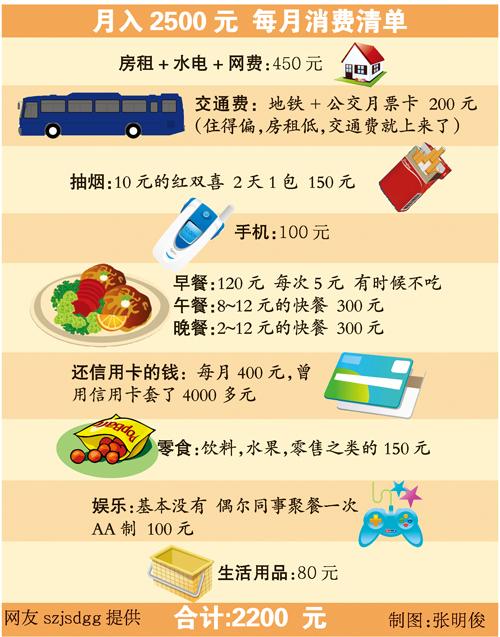近日,一名剛剛踏入職場的年輕白領szjsdgg在大洋網(wǎng)上稱自己“月薪2500元在廣州的生活”:大學畢業(yè)1年半,工作1年多,現(xiàn)在在廣州拿著2500元左右的月薪,剛夠基本生活開銷,只剩下300元。