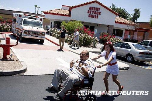 6月17日,在美國亞利桑那州錢德勒的“心臟病燒烤”餐廳,女服務(wù)員用輪椅推著用餐后的食客離開。新華社/路透