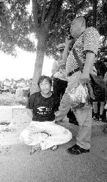 昨日9時45分,記者趕到京廣南路中陸物流廣場西側(cè)的馬路邊,一名穿著白褲子的男子目光呆滯地坐在路邊,他身上多處被鮮血染紅。特巡警三大隊民警已經(jīng)將其控制,急救人員正在給他包扎右手上的傷口。