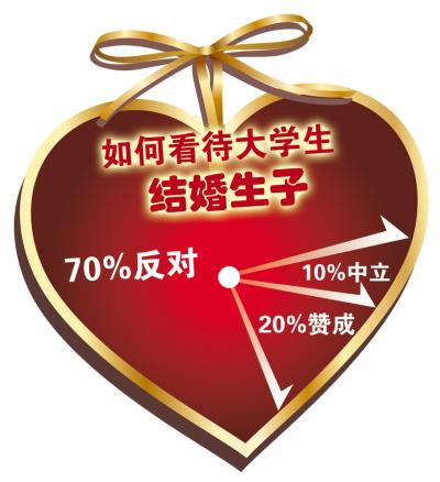 在校大學生結婚生子,社會是怎么看待的呢?記者昨日通過網絡隨機采訪了30位網友,他們中有公務員、醫(yī)生、教師、大學生、白領、工人、家庭主婦等各類人群。結果顯示,約7成人反對,2成人贊成,還有1成人持中立態(tài)度。