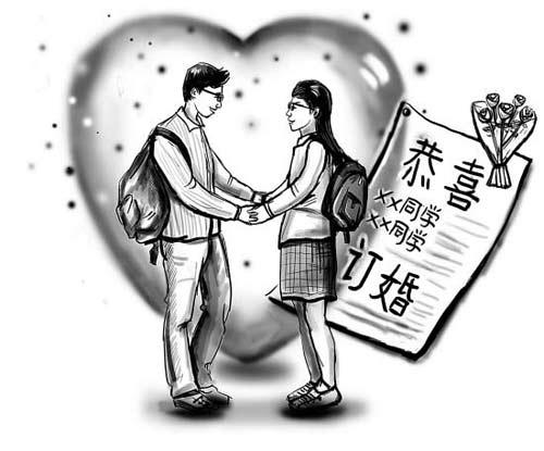 可當事人的特殊身份,卻讓記者幾度懷疑這是虛假消息——訂婚的正是小記者的同學,杭州某中學高三兩位剛剛參加完高考的學生。現(xiàn)在大學生結婚也少有人能接受,乍聽說這則中學校園里傳出的雷人婚訊,記者半晌沒回過神來。