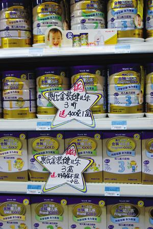 但昨天在一些商場看到的惠氏促銷廣告上赫然標注著:“購買900克的三聽,送400克的一盒!秉S女士跟記者算這筆賬:“一聽金裝幼兒樂第三階段奶粉漲了17元,如果買三盒,就等于貴了51元,但贈送一盒400克裝的,價值56元(漲價前),算起來,等于沒漲價。只是要多買幾瓶罷了。但現(xiàn)在是夏天,也不知道奶粉多買了能不能保存!