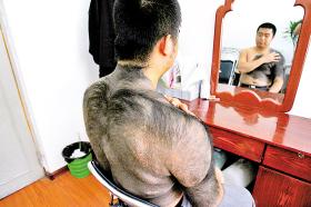 昨天中午,趁著小宋午休,記者約見(jiàn)了他。23歲的小宋,濃眉大眼,俊朗有型。在休息室里,小宋脫掉了紫色上衣,他的前胸立刻露出一大片黑色痕跡,上面還長(zhǎng)有毛發(fā),后背幾乎完全被黑色痕跡覆蓋,右臂和頸后毛發(fā)顏色最重。乍一看真的挺像穿著一件黑色毛坎肩。小宋笑笑:“很熱,但都習(xí)慣了。小時(shí)候這胎記很癢,我撓出血了,線衣緊緊粘在身上,揭不下來(lái)了,后來(lái)用鹽水浸泡才撕下來(lái)!