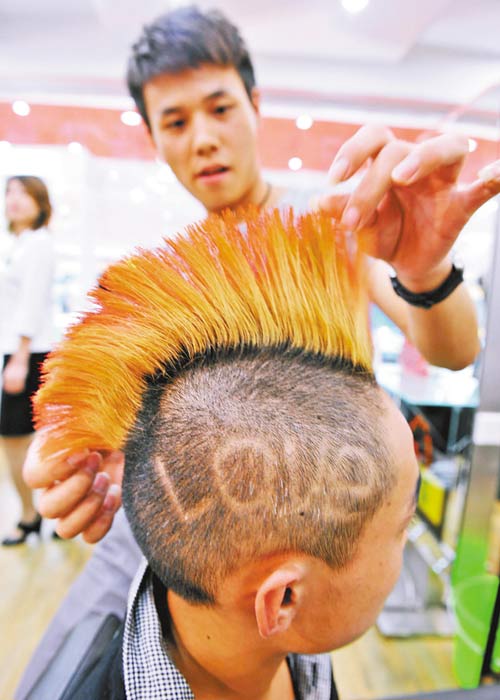 這款發(fā)型吸引了許多人的目光,中間的頭發(fā)全部豎起,然后用紅黃兩種顏色漂染,最后在頭右側用剃刀畫出了一個清晰的“LOVE”。