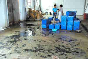 一跨進(jìn)消毒車間門檻,撲面而來的是刺鼻臭味,地上大片藍(lán)黑色的污水令人作嘔。除了三兩個(gè)負(fù)責(zé)清洗的女工戴著膠皮手套,其他十幾個(gè)工人都沒穿工作服或是佩戴口罩、手套,負(fù)責(zé)清洗的女工說:“不戴手套,火堿刷碗燒得手疼”。
