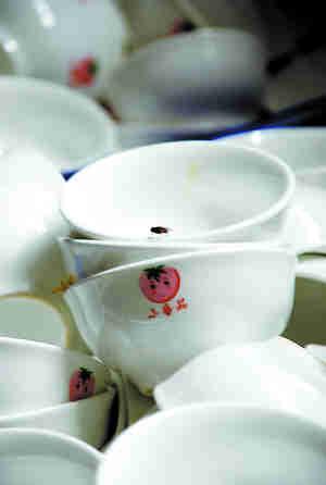 加工車間的門窗開著,洗好的碗碟被一股腦兒擠進(jìn)一個(gè)個(gè)粘著一層油漬的箱子里,蒼蠅圍繞著這些碗碟上下紛飛。工作臺(tái)上,四名女工正在給裝進(jìn)塑料袋的碗碟封口。當(dāng)執(zhí)法人員搬開一臺(tái)塑封機(jī)時(shí),3只蟑螂一下子鉆進(jìn)碗碟堆里。