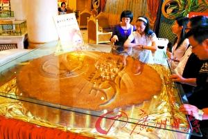 據(jù)介紹,月餅總重為380公斤,直徑160厘米,厚18厘米。為制作此餅,他們專(zhuān)門(mén)請(qǐng)了8個(gè)師傅做,僅制作成型就花了16個(gè)小時(shí),然后又烘烤了4個(gè)小時(shí)才完成。僅極品蛋黃就用了30公斤,白蓮蓉用了180公斤,面粉用了150公斤。(記者王鵬、何波攝影報(bào)道)