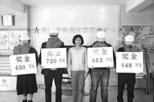 網(wǎng)民點(diǎn)評(píng):從圖上來看,中獎(jiǎng)獎(jiǎng)金是從貴州省體育彩票管理中心頒出的,領(lǐng)獎(jiǎng)人頭戴棒球帽,胸前戴朵大紅花,為了不被拍到正面,全都低下了腦袋!邦I(lǐng)獎(jiǎng)該高興啊,從這圖來看,怎么看都是很沮喪!本W(wǎng)民說,下次再有中獎(jiǎng)?wù)撸纱喔銈(gè)蒙面舞會(huì)。