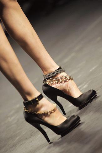 不景氣時期,女人的鞋跟似乎會變高,很顯然,本季天馬行空的鞋形正是對經(jīng)濟(jì)蕭條的一種藐視。然而關(guān)于高跟鞋究竟象征著女權(quán)還是男權(quán)的爭論已經(jīng)持續(xù)了幾十年,時尚史學(xué)家Giorgio Riello 與Peter McNeil 在《鞋子:從涼鞋到球鞋的歷史》一書中指出,1920 年代的婦女參政多以穿高跟鞋來展現(xiàn)女性特質(zhì),她們穿著鈕扣靴和高跟運(yùn)動鞋向世人證明,參政并不會抹煞女人味。
