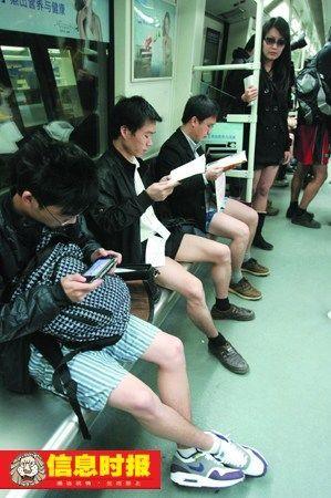 昨日中午12點(diǎn)左右,從廣州二號(hào)線萬勝圍站開出的地鐵車廂里,20多名只穿短褲,露出大腿的青年男女旁若無人地翻閱報(bào)紙或看書,此舉引來很多乘客的關(guān)注。據(jù)稱,這群年輕人是想借此宣傳環(huán)保,提倡低碳生活。